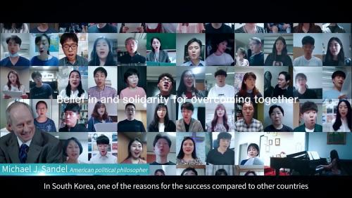 ¿µ»ó¿¡¼´Â ¼¼°è ¼®Çаú ±¹³»¿Ü ½Ã¹ÎµéÀÇ ÀÎÅͺ並 ÅëÇØ ¡°¿ì¸®´Â ¸ðµÎ °°Àº ½Î¿òÀ» Çϰí ÀÖ´Ù.(±â ¼Ò¸£¸Á Guy Sorman, ÇÁ¶û½ºÀÇ ¹®¸í ºñÆò°¡)¡±, ¡°Àý¸ÁÇÏÁö ¾Ê°í »õ·Î¿î ´«À¸·Î ¼¼»óÀ» ºÁ¾ß ÇÒ ½Ã±â(½Ã¹Îµé)¡±¶ó°í ¸»ÇÑ´Ù. ÀÌ¾î ¡°Çѱ¹ÀÌ ¼º°øÀûÀÎ ¹æ¿ª ¼º°ú¸¦ °ÅµÐ ÀÌÀ¯ Áß Çϳª´Â °øµ¿Ã¼ Àǽİú »çȸÀû °á¼Ó·Â(¸¶ÀÌŬ ¼¾µ¨, Michael J. Sandel, ¹Ì±¹ ÇϹöµå´ë ±³¼ö)¡±À̶ó¸ç ³¡ÀÌ º¸ÀÌÁö ¾Ê´Â °¨¿°º´°úÀÇ ½Î¿òÀ» À̰ܳ¾ ¼ö ÀÖ´Â ºñ°áÀº ÇÔ²² À̰ܳ¾ ¼ö ÀÖ´Ù´Â ¹ÏÀ½°ú ¿¬´ë¶ó°í °Á¶ÇÑ´Ù.