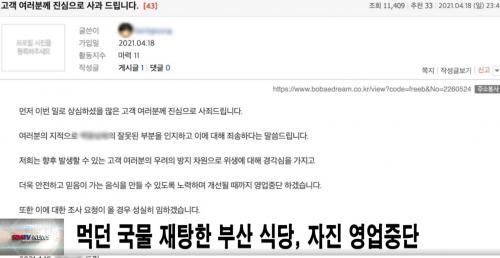 [Çѱ¹BBC¹æ¼Û´º½º=±Ç¹Î¾Æ ±âÀÚ] ¼Õ´ÔÀÌ ¸Ô´ø ¾î¹¬ÅÁÀ» À°¼öÅë¿¡ ³Ö¾î Àç»ç¿ëÇß´Ù´Â ³í¶õÀ» ÀÏÀ¸Å² ºÎ»êÀÇ ÇÑ ½Ä´ç ÃøÀÌ »ç°úÇÏ°í ¿µ¾÷À» Áß´ÜÇß´Ù.