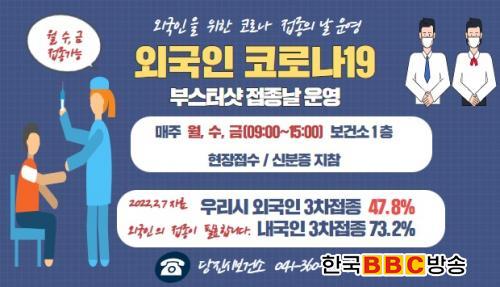 Á¢Á¾ ´ë»óÀº °ü³» Äڷγª19 ¹é½ÅÀ» ¸ÂÁö ¾ÊÀº ¿Ü±¹ÀÎÀ¸·Î ¿©±Ç µîÀÇ ½ÅºÐÁõÀ» ÁöÂüÇØ ´çÁø½Ãº¸°Ç¼Ò(¢Ï041-360-6004)¸¦ ¹æ¹®ÇÏ¸é ´çÀÏ Á¢Á¾¹ÞÀ» ¼ö ÀÖ´Ù.