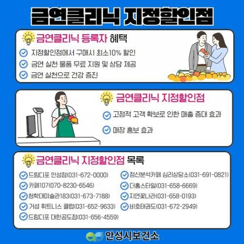 ¡®±Ý¿¬Å¬¸®´Ð ÁöÁ¤ÇÒÀÎÁ¡¡¯Àº Áö³ÇØ 7¿ùºÎÅÍ ¸ðÁýÇϰí ÀÖÀ¸¸ç, ÇöÀç ¾È¼º½Ã¿¡´Â 9°³ÀÇ ÁöÁ¤ÇÒÀÎÁ¡ÀÌ ÀÖ´Ù. ¾È¼º½Ãº¸°Ç¼Ò ±Ý¿¬Å¬¸®´Ð µî·ÏÀÚ´Â ±Ý¿¬Å¬¸®´Ð µî·ÏÁõÀ» °¡Áö°í ÁöÁ¤ÇÒÀÎÁ¡ ¹æ¹® ½Ã ÃÖ¼Ò 10%ÀÇ °¡°Ý ÇÒÀÎ ÇýÅÃÀ» ¹ÞÀ» ¼ö ÀÖÀ¸¸ç, ÁöÁ¤ÇÒÀÎÁ¡ ¸ñ·ÏÀº ¾È¼º½Ãº¸°Ç¼Ò ȨÆäÀÌÁö¿¡¼ È®ÀÎÇÒ ¼ö ÀÖ´Ù.
