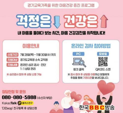 µµ±³À°Ã»Àº ¿ÃÇØ °æ±âµµ±³À°Ã» ¼Ò¼Ó ±³Á÷¿ø 17¸¸¿© ¸íÀ» ´ë»óÀ¸·Î Èñ¸ÁÀÚ¿¡ ÇÑ ÇØ ¿Â¶óÀÎ ½É¸® °Ë»ç¸¦ ÁøÇàÇÏ°í ±× °á°ú¿¡ µû¶ó Àü¹®°¡ »ó´ãÀ» °³Àκ°·Î ½ÅÃ»ÇØ ÃÖ´ë 8ȸ±îÁö ¹«·á·Î ¹ÞÀ» ¼ö ÀÖµµ·Ï ¸¶·ÃÇß´Ù.