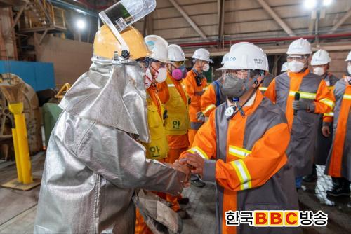 Á¤ ½ÃÀåÀº ÇöÀå Á÷¿øµé¿¡°Ô Á÷Á¢ °Ý·ÁÀÇ Àλ縦 ÀüÇϱâ À§ÇØ ¾ÈÀüº¹°ú ¾ÈÀüº¸È£±¸¸¦ Âø¿ëÇÏ°í °øÀå °÷°÷À» ´Ù´Ï¸ç ¼¼°è ÃÖ°íÀÇ Ã¶° Á¦Ç°À» »ý»êÇϱâ À§ÇØ ¹¬¹¬È÷ Èû¾²´Â Á÷¿øµéÀÇ ³ë°í¿¡ °¨»ç¸¦ Ç¥Çß´Ù.
