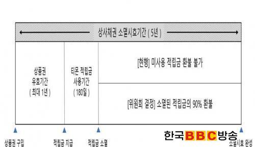 Çѱ¹¼ÒºñÀÚ¿ø ¼ÒºñÀÚºÐÀïÁ¶Á¤À§¿øÈ¸(À§¿øÀå º¯¿õÀç, ÀÌÇÏ ¡®À§¿øÈ¸¡¯)´Â À¯È¿±â°£ÀÌ °æ°úÇÑ ½ÅÀ¯Çü»óǰ±Ç(ÀÌÇÏ ¡®»óǰ±Ç¡¯)°ú °ü·ÃÇÏ¿© ¡®»óǰ±Ç ±¸¸Å±Ý¾×À» Àû¸³±ÝÀ¸·Î Áö±ÞÇÏ´Â »ç¾÷ÀÚÀÇ È¯ºÒÁ¤Ã¥¿¡ µû¶ó Àû¸³µÈ ±Ý¾×(ÀÌÇÏ ¡¯Àû¸³±Ý¡®)À» »ç¿ë±âÇÑ ³» »ç¿ëÇÏÁö ¸øÇØ ¼Ò¸êµÈ °æ¿ì¿¡µµ »ó»çä±Ç ¼Ò¸ê½ÃÈ¿±â°£(5³â)ÀÌ °æ°úÇÏÁö ¾Ê¾Ò´Ù¸é ÇØ´ç Àû¸³±ÝÀÇ 90%¸¦ ȯ±ÞÇØ¾ß ÇÑ´Ù.¡¯°í °áÁ¤Çß´Ù.