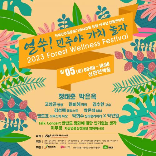 Áö¿ªÀÇ ¹ÎÁÖȿ °øÇåÀÚ¿Í ½Ã¹Î»çȸ Ȱµ¿°¡´Â ¹°·Ð Æí¹é½£À» ã´Â µµ¹Îµé ´©±¸³ª °¡Á·º°, ´Üüº° Âü¿©°¡ °¡´ÉÇϸç, ÁÖ¿ä Çà»ç·Î Æí¹é½£ °È±â, ³ëõÀ¯È²ÅÁ Á·¿å, À̺οµ ÀÚÀ¯¾ð·Ð½ÇõÀç´Ü ¸í¿¹ÀÌ»çÀåÀÇ ÅäÅ©ÄܼƮ ½Ã±¹°¿¬, °í¾ç°ï ¸íâ, ±è¹ÌÇý °í¼ö, ±è¼ºÅà ÿ¸®½ºÆ®, ¹ÚÁؼ® Å׳Ê, ¹êµåÁÒ ¾îÄí½ºÆ½ µà¿À, ¹ÚÈñ¼ö ½Ì¾î¼Û¶óÀÌÅÍ, ¹ÚÀο À½¾Ç°¡ µîÀÌ Ã⿬ÇÏ´Â ÆÇ¼Ò¸®, Ŭ·¡½Ä, ¹êµå °ø¿¬°ú ÇÔ²² Èú¸µ ¹ÂÁ÷ÄܼƮ°¡ ÆîÃÄÁö¸ç, Á¤ÅÂÃá, ¹ÚÀº¿Á ÃÊû°ø¿¬ÀÌ ´ë¹Ì¸¦ Àå½ÄÇÑ´Ù.