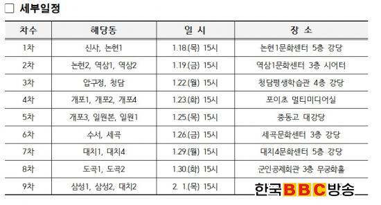 º¸°íȸ´Â °³²±¸ 22°³ µ¿À» 2~3°³¾¿ ¹¾î ÃÑ 9ȸ¿¡ °ÉÃÄ ÁøÇàÇÑ´Ù. ¼¼ºÎ ÀÏÁ¤À» º¸¸é. 1Â÷´Â ½Å»ç¡¤³íÇö1µ¿À¸·Î 1¿ù 18ÀÏ ³íÇö1¹®È¼¾ÅÍ 5Ãþ °´ç. 2Â÷ ³íÇö2¡¤¿ª»ï1¡¤¿ª»ï2µ¿ 1¿ù 19ÀÏ ¿ª»ï1¹®È¼¾ÅÍ 3Ãþ ½Ã¾îÅÍ. 3Â÷ ¾Ð±¸Á¤¡¤Ã»´ãµ¿ 1¿ù 22ÀÏ Ã»´ãÆò»ýÇнÀ°ü 4Ãþ °´ç. 4Â÷ °³Æ÷1¡¤°³Æ÷2¡¤°³Æ÷4µ¿ 1¿ù 23ÀÏ Æ÷ÀÌÃÊ ¸ÖƼ¹Ìµð¾î½Ç. 5Â÷ °³Æ÷3¡¤ÀÏ¿øº»¡¤ÀÏ¿ø1µ¿ 1¿ù 25ÀÏ Áßµ¿°í ´ë°´ç. 6Â÷ ¼ö¼¡¤¼¼°îµ¿ 1¿ù 26ÀÏ ¼¼°î¹®È¼¾ÅÍ 3Ãþ °´ç. 7Â÷ ´ëÄ¡1¡¤´ëÄ¡4µ¿ 1¿ù 29ÀÏ ´ëÄ¡4¹®È¼¾ÅÍ 5Ãþ °´ç. 8Â÷ µµ°î1¡¤µµ°î2µ¿ 1¿ù 30ÀÏ ±ºÀΰøÁ¦È¸°ü 3Ãþ ¹«±ÃÈȦ. 9Â÷ »ï¼º1¡¤»ï¼º2¡¤´ëÄ¡2µ¿ 2¿ù 1ÀÏ ´ëÄ¡2¹®È¼¾ÅÍ 3Ãþ °´ç¿¡¼ ¿¸°´Ù. ¸ðµÎ ¿ÀÈÄ 3½Ã¿¡ °³ÃÖÇϸç, ±¸Á¤¿¡ °ü½É ÀÖ´Â ÁÖ¹ÎÀÌ¸é ´©±¸³ª Âü¿©ÇÒ ¼ö ÀÖ´Ù.