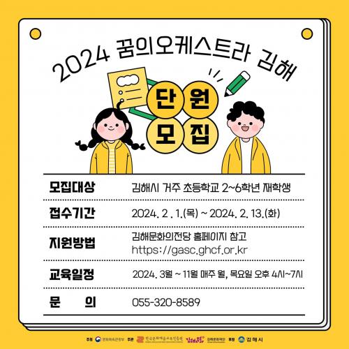 À̹ø ½Å±Ô´Ü¿ø ¸ðÁý´ë»óÀº À½¾Ç¿¡ °ü½É°ú ¿Á¤ÀÌ ÀÖ´Â ±èÇØ½Ã °ÅÁÖ ÃʵîÇб³ 2 ~ 6Çгâ ÀçÇлý 15¸í ³»¿Ü·Î, Ãë¾à°èÃþÀ» ¿ì´ë ¼±¹ßÇÒ ¿¹Á¤ÀÌ´Ù. Á¢¼ö´Â ±èÇØ¹®ÈÀÇÀü´ç ȨÆäÀÌÁö¿¡¼ ¾ç½ÄÀ» ´Ù¿î¹Þ¾Æ À̸ÞÀÏ(gascart2005@gmail.com)·Î Á¢¼öÇÏ¸é µÈ´Ù. »ó¼¼ ³»¿ëÀº ±èÇØ¹®ÈÀÇÀü´ç ȨÆäÀÌÁö(https://gasc.ghcf.or.kr/home/main)¿¡¼ È®ÀÎ °¡´ÉÇÏ´Ù.