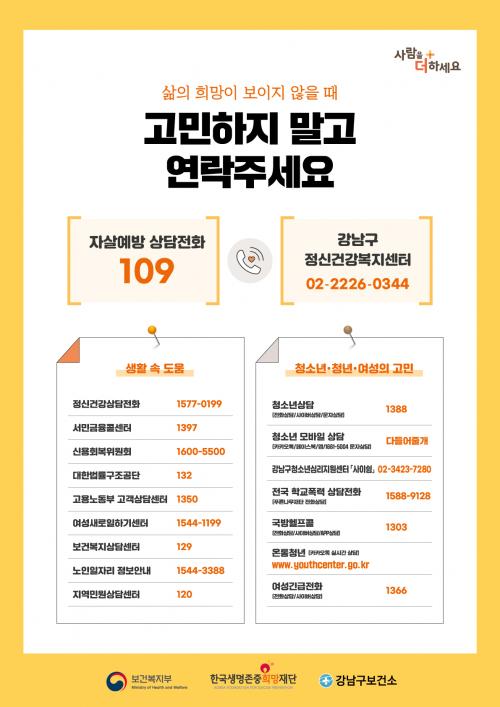 ÀÌ Æ÷½ºÅÍ´Â °³²±¸Á¤½Å°Ç°º¹Áö¼¾ÅÍ(¢Ï02-2226-0344), Àڻ쿹¹æ »ó´ãÀüÈ(¢Ï109), 24½Ã°£ Á¤½Å°Ç° »ó´ãÀüÈ (¢Ï1577-0199) µî ´Ù¾çÇÑ ¾î·Á¿òÀ» »ó´ã¹ÞÀ» ¼ö ÀÖ´Â ±â°ü 18°÷ÀÇ ¿¬¶ôó¸¦ ¼ö·ÏÇß´Ù. °³²±¸Á¤½Å°Ç°º¹Áö¼¾ÅÍ Ä«Ä«¿ÀÅå ä³Î °¡ÀÔÀÚ 883¸í¿¡°Ôµµ ¾È³»¹®À» ¹èÆ÷Çß´Ù.