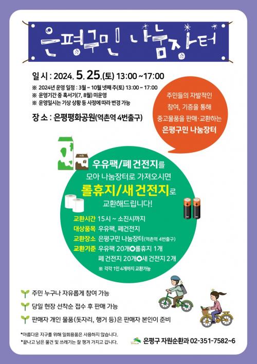 ¡®ÀºÆò±¸¹Î ³ª´®ÀåÅÍ¡¯´Â ±¸¹ÎµéÀÌ Áß°í ÀçȰ¿ë ¹°Ç°ÀÎ ÀÇ·ù, Àå³°¨, µµ¼, ÀâÈ µîÀ» ¼·Î ±³È¯ÇÏ°í ÆÇ¸ÅÇÏ´Â ³ª´®ÀÇ ÀåÀÌ´Ù. ÀÌ´Â ÀÚ¿ø ³¶ºñ¸¦ ¸·°í, ³ª´® ¹®È¸¦ È®»êÇϸç ȯ°æÀ» º¸È£ÇÏÀÚ´Â ÃëÁö·Î ¿î¿µµÇ°í ÀÖ´Â Çà»ç´Ù.
