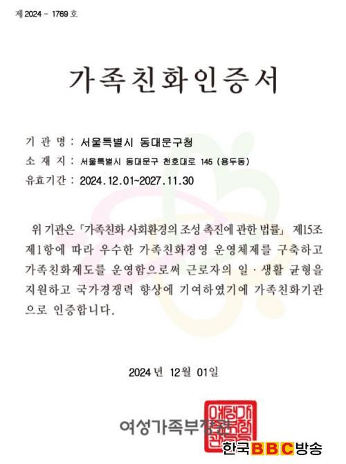 [Çѱ¹BBC¹æ¼Û µ¿´ë¹®±¸=À̽ŵ¿±âÀÚ] ¼­¿ï µ¿´ë¹®±¸°¡ 12¿ù 1ÀÏ ¿©¼º°¡Á·ºÎ ¡®°¡Á·Ä£È­±â°ü¡¯À¸·Î ÀçÀÎÁõ ¹Þ¾Ò´Ù. 2013³â °¡Á·Ä£È­±â°üÀ¸·Î ÃÖÃÊ ÀÎÁõµÈ µ¿´ë¹®±¸´Â À̹ø ÀÎÁõÀ¸·Î 2027³â 11¿ù 30ÀϱîÁö ¸í¿¹¸¦ À¯ÁöÇÏ°Ô µÆ´Ù.