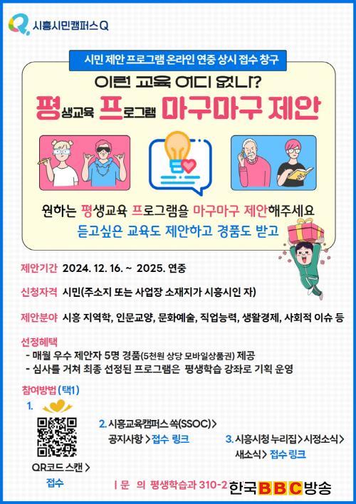 [Çѱ¹BBC¹æ¼Û ½ÃÈï½Ã=À̽ŵ¿±âÀÚ] ½ÃÈï½Ã´Â ½Ã¹ÎÀÇ ´Ù¾çÇÑ ¿ä±¸¸¦ ¹Ý¿µÇÑ ¸ÂÃãÇü Æò»ýÇнÀ ÇÁ·Î±×·¥À» ±âȹÇϰíÀÚ ¡®Æò»ýÇнÀ ÇÁ·Î±×·¥ ¸¶±¸¸¶±¸ Á¦¾È¡¯ ¿Â¶óÀÎ »ó½Ã Á¢¼ö ⱸ¸¦ ¿î¿µÇϸç, À̸¦ ÅëÇØ ¼±Á¤µÈ ½Ã¹Î Á¦¾È ÇÁ·Î±×·¥À» 2025³â ¿¬Áß ¿î¿µÇÒ °èȹÀÌ´Ù.