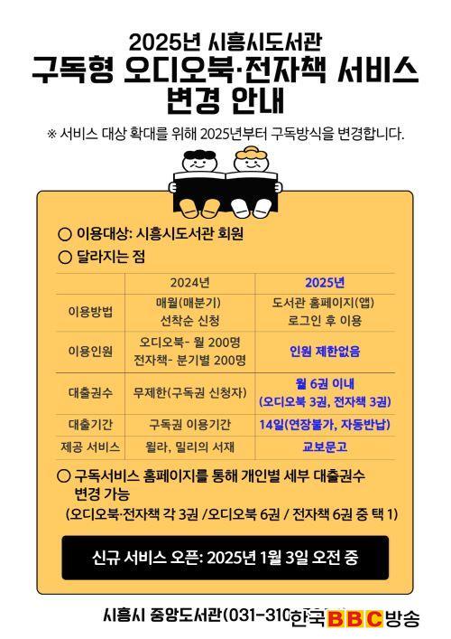 2025³âºÎÅÍ´Â º°µµÀÇ ½Åû ÀýÂ÷ ¾øÀÌ ½ÃÈï½Ãµµ¼°ü ȸ¿øÀ̶ó¸é ´©±¸³ª ÀüÀÚÃ¥°ú ¿Àµð¿ÀºÏÀ» ÀÚÀ¯·Ó°Ô ÀÌ¿ëÇÒ ¼ö ÀÖ´Ù. ´Ù¸¸, ¿øÈ°ÇÑ ¼ºñ½º ¿î¿µÀ» À§ÇØ 1ÀÎ´ç ¿ù ´ëÃâ °¡´É ±Ç¼ö´Â 6±ÇÀ¸·Î Á¦ÇѵǸç, ¼ºñ½º ÀÌ¿ëÀº 1¿ù 3ÀϺÎÅÍ °¡´ÉÇÏ´Ù.