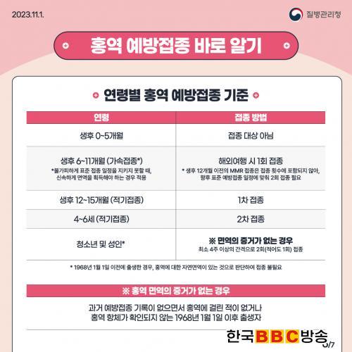 ´ÙÇàÈ÷ È«¿ªÀº ¹é½Å Á¢Á¾À¸·Î 90% ÀÌ»ó ¿¹¹æÀÌ °¡´ÉÇÏ´Ù. È«¿ª¹é½Å(MMR)À» 2ȸ ¸ðµÎ Á¢Á¾Çß´ÂÁö È®ÀÎÇϰí, Á¢Á¾ ¿©ºÎ°¡ ºÒÈ®½ÇÇÑ °æ¿ì Ãâ±¹ 4~6ÁÖ Àü 2ȸ Á¢Á¾(ÃÖ¼Ò 4ÁÖ °£°Ý)À» ¿Ï·áÇØ¾ß ÇÑ´Ù.