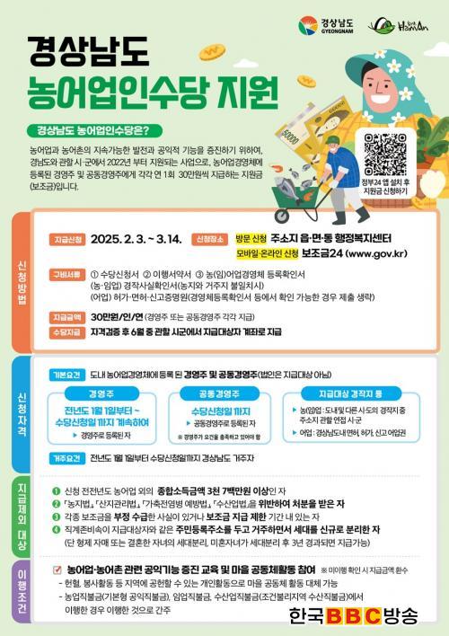 Áö±Þ ´ë»óÀÚ´Â 2024³â 1¿ù 1ÀϺÎÅÍ ¼ö´ç ½ÅûÀϱîÁö °æ»ó³²µµ¿¡ °ÅÁÖÇÏ¸é¼ ³ó¾î¾÷°æ¿µÃ¼¿¡ µî·ÏµÈ °æ¿µÁÖ¿Í °øµ¿°æ¿µÁÖÀ̸ç, °øµ¿°æ¿µÁÖ´Â ³ó¾î¾÷°æ¿µÃ¼¿¡ °æ¿µÁÖ ¿Ü ³ó¾÷ÀÎÀ¸·Î µîÀçµÈ °æ¿µÁÖÀÇ ¹è¿ìÀڷμ ¼ö´ç ½ÅûÀÏ(3¿ù 14ÀÏ)±îÁö °øµ¿°æ¿µÁÖ·Î µî·ÏÇÏ¸é µÈ´Ù.