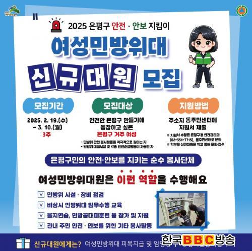 ¸ðÁý½Ã±â ±âÁØ ÀºÆò±¸ ¿©¼º¹Î¹æÀ§´ë¿øÀÇ Çö¿øÀº 82¸íÀÌ´Ù. ½Å±Ô ´ë¿øÀÇ Áö¿ø °¡´É Á¶°ÇÀº ±¸ÀÇ ¾ÈÀü‧¾Èº¸¸¦ À§ÇØ Àû±ØÀûÀ¸·Î ºÀ»çÇϰíÀÚ ÇÏ´Â ¸¶À½À» °®Ãá ÀÚ, ¹Î¹æÀ§ ´ëÇǽü³ ¹× ±¸¹ÎÀ» À§ÇÑ °¢Á¾ ¾ÈÀü¼øÂûȰµ¿ÀÌ °¡´ÉÇÑ ÀÚ·Î À§ÀÇ 2°¡Áö¸¦ ÃæÁ·ÇÏ´Â ÀºÆò±¸ °ÅÁÖ ¿©¼ºÀÌ´Ù.