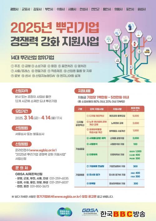 [Çѱ¹BBC¹æ¼Û ½ÃÈï½Ã=À̽ŵ¿±âÀÚ] ½ÃÈï½Ã´Â °ü³» »Ñ¸®±â¾÷ÀÇ ³°Àº ½Ã¼³°³¼± µîÀ» ÅëÇÑ °øÁ¤Çõ½Å°ú ±â¼ú ǰÁú °È¸¦ À§ÇÑ ¡®2025³â »Ñ¸®±â¾÷ °æÀï·Â °È Áö¿ø»ç¾÷¡¯¿¡ Âü¿©ÇÒ ±â¾÷À» 3¿ù 14ÀϺÎÅÍ ¸ðÁýÇϰí ÀÖ´Ù.