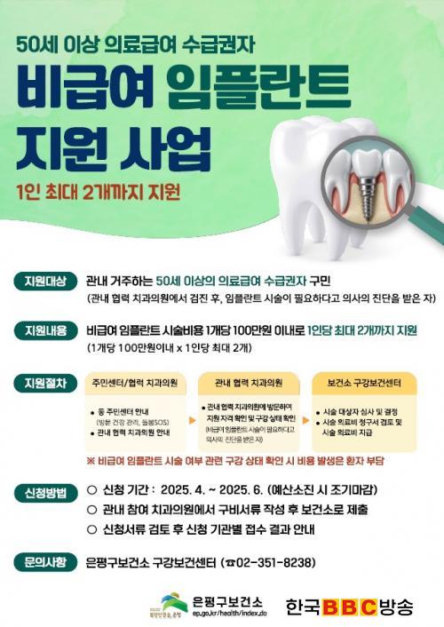 Áö¿ø ´ë»óÀº Áֹεî·Ï»ó ÀºÆò±¸¿¡ ÁÖ¼Ò¸¦ µÎ°í °ÅÁÖ ÁßÀÎ 50¼¼ ÀÌ»óÀÇ ÀÇ·á±Þ¿© ¼ö±Þ±ÇÀÚ·Î ÀÓÇöõÆ® ½Ã¼úÀÌ ÇÊ¿äÇÏ´Ù°í Áø´ÜÀ» ¹ÞÀº ÀÚÀÌ´Ù. ½ÅûÇÑ ¼ø¼·Î ¼±Á¤µÇ°í, ´ë»óÀÚ·Î °áÁ¤µÇ¸é °ü³» Çù·Â Ä¡°úÀÇ¿ø¿¡¼ ÀÓÇöõÆ® ½Ã¼úÀ» ¹ÞÀ» ¼ö ÀÖ´Ù.