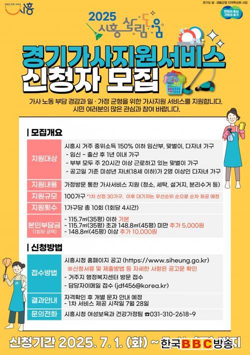½Ã´Â À̹ø ½Åû°ø°í¸¦ ÅëÇØ 7¿ù 18ÀÏ 30°¡±¸¸¦ ¿ì¼± ¼±Á¤ ÈÄ, °ø°í¹® ³» ±âÀçµÈ ¿ì¼±¼øÀ§¿¡ µû¶ó 11¿ù ¸»±îÁö ³ª¸ÓÁö 70°¡±¸¿¡ ¼øÂ÷ÀûÀ¸·Î ¼ºñ½º¸¦ Á¦°øÇÒ ¿¹Á¤ÀÌ´Ù. ¼±Á¤µÈ °¡±¸´Â 7¿ù ¸»ºÎÅÍ °¡»ç°ü¸®»ç ¿¬°áÀ» ÅëÇØ °¡±¸´ç ÃÑ 10ȸÀÇ °¡»ç¼ºñ½º(û¼Ò¤ý¼³°ÅÁö¤ý¼¼Å¹¤ý¾²·¹±â ºÐ¸®¼ö°Å)¸¦ Áö¿ø¹ÞÀ» ¼ö ÀÖ´Ù.