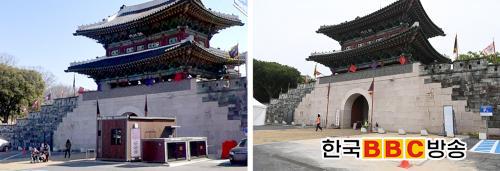 [Çѱ¹BBC¹æ¼Û °æ³²ÁøÁÖ=³²±Ã¿µ±â±âÀÚ] ÁøÁֽô 1ÀÏ ÁøÁÖ¼º °øºÏ¹® ¾ÕÀ» °¡·Î¸·¾Æ ½Ã°¢ÀûÀ¸·Î Á¶È­·ÓÁö ¸øÇß´ø ¸ÅÇ¥¼Ò¸¦ ±âÁ¸ °ü±¤¾È³»¼Ò ¿·À¸·Î ÀÌÀü ¼³Ä¡ÇÏ¿© ÁøÁÖ¼º ¼ºº®°ú °øºÏ¹® °æ°üÀ» ȸº¹Çß´Ù°í ¹àÇû´Ù.