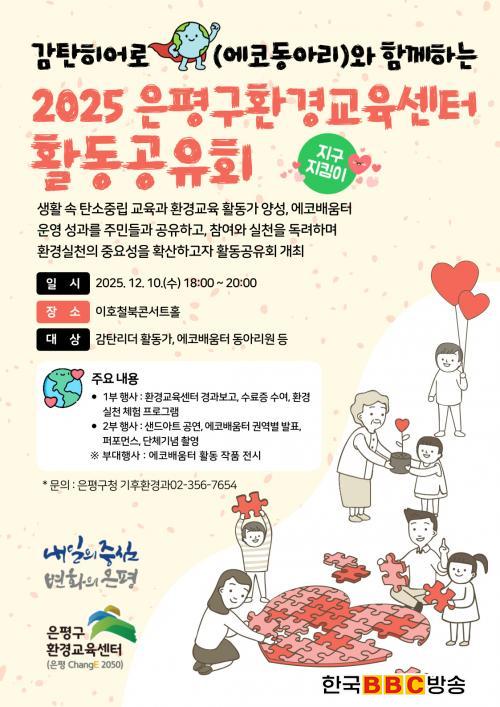 [Çѱ¹BBC¹æ¼Û ÀºÆò±¸=À̽ŵ¿±âÀÚ] ¼­¿ï ÀºÆò±¸´Â ¿À´Â 10ÀÏ Áֹΰú ÇÔ²² ¸¸µç ȯ°æ±³À° ¼º°ú¸¦ °øÀ¯ÇÏ´Â ¡®°¨ÅºÈ÷¾î·Î¿Í ÇÔ²²Çϴ ȯ°æ±³À° Ȱµ¿°øÀ¯È¸¡¯¸¦ °³ÃÖÇÑ´Ù°í ¹àÇû´Ù.