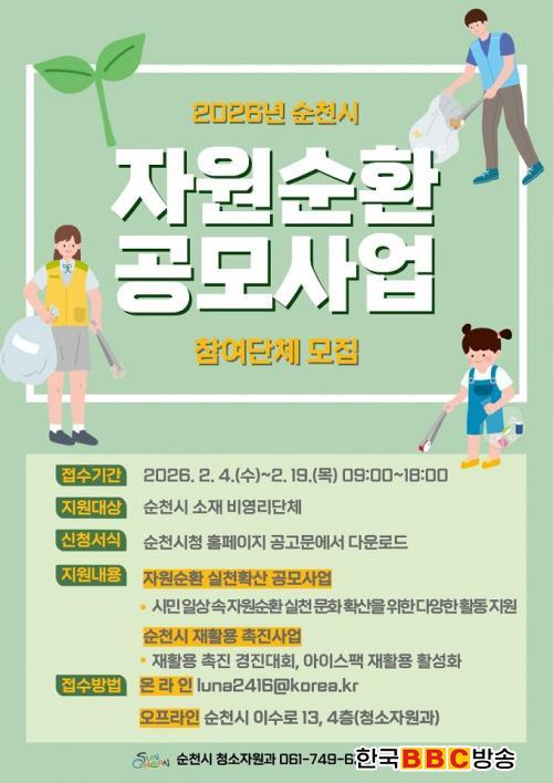 [Çѱ¹BBC¹æ¼Û ¼øÃµ=±è¿ëÈÆ ±âÀÚ] ¼øÃµ½Ã´Â ½Ã¹ÎÀÇ ÀÏ»ó ¼Ó ÀÚ¿ø¼øÈ¯ ¹®È­ È®»ê°ú ÀçȰ¿ë ½Çõ Ȱ¼ºÈ­¸¦ À§ÇØ 2026³â ÀÚ¿ø¼øÈ¯ °ø¸ð»ç¾÷ Âü¿© ´Üü¸¦ ¸ðÁýÇÑ´Ù°í ¹àÇû´Ù.