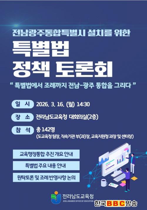 Àü¶ó³²µµ±³À°Ã»Àº ¿À´Â 16ÀÏ(¿ù) û»ç ´ëȸÀǽǿ¡¼ ¡®Æ¯º°¹ý¿¡¼ Á¶·Ê±îÁö, Àü³²¡¤±¤ÁÖ ±³À°ÇàÁ¤ÅëÇÕÀÇ Á¦µµÀû ±âƲÀ» ±×¸®´Ù¡¯¸¦ ÁÖÁ¦·Î Á¤Ã¥Åä·Ðȸ¸¦ °³ÃÖÇÑ´Ù.