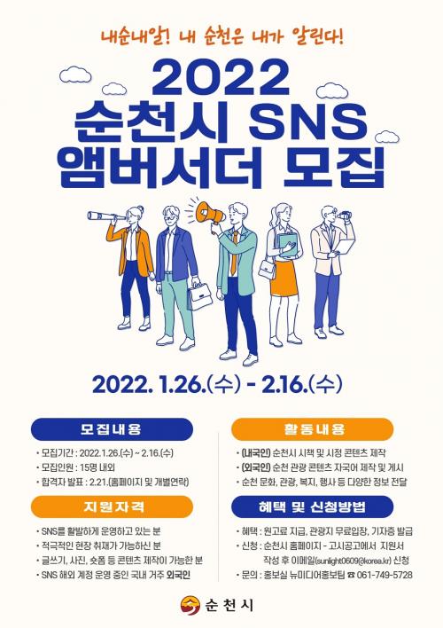 [Çѱ¹BBC¹æ¼Û=±è¿ëÈÆ ±âÀÚ] ¼øÃµ½Ã(½ÃÀå Çã¼®)°¡ ¿À´Â 16ÀϱîÁö ³»¡¤¿Ü±¹ÀΠû³â(¸¸ 19¼¼~39¼¼)À» ´ë»óÀ¸·Î ¡®2022 ¼øÃµ½Ã SNS ¾Ú¹ö¼´õ¡¯¸¦ ¸ðÁýÇÑ´Ù. SNS ¾Ú¹ö¼´õ´Â ¼øÃµÀÇ ½ÃÁ¤, ¹®È, °ü±¤, º¹Áö µî ´Ù¾çÇÑ È«º¸ ÄÜÅÙÃ÷¸¦ ¹ß±¼Çϰí ÇöÀåÃëÀç ¹× ±â»ç Á¦ÀÛÀ» Å롦