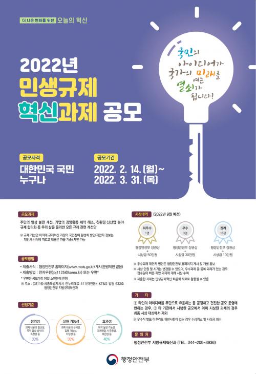 [Çѱ¹BBC¹æ¼Û=¹Ú±¤¿Á ±âÀÚ] ±¤¾ç½Ã´Â ÇàÁ¤¾ÈÀüºÎ¿Í ÇÔ²² ¡®2022³â ±¹¹ÎÀÌ Á¦¾ÈÇϰí Ç®¾î°¡´Â ¹Î»ý±ÔÁ¦ Çõ½Å°úÁ¦ °ø¸ðÀü¡¯À» °³ÃÖÇÑ´Ù. À̹ø °ø¸ðÀüÀº ½Ã¹ÎÀÇ ÀÏ»ó»ýȰÀ̳ª ±â¾÷ÀÇ °æ¿µÈ°µ¿¿¡ ºÒÆíÀ» ÁÖ´Â ºÒÇÕ¸®ÇÑ ±ÔÁ¦¸¦ ¹ß±¼Çϰí ÇØ¼ÒÇϱâ À§ÇØ ¡®±¹¹ÎÀÇ ¾ÆÀ̵ð¾î°¡¡¦