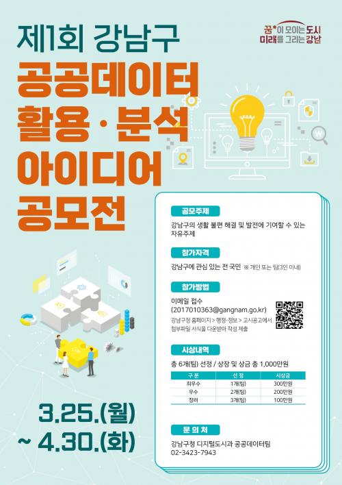 [Çѱ¹BBC¹æ¼Û °­³²=À̽ŵ¿±âÀÚ]°­³²±¸°¡ ¡®Á¦1ȸ °­³²±¸ °ø°øµ¥ÀÌÅÍ È°¿ë¡¤ºÐ¼® ¾ÆÀ̵ð¾î °ø¸ðÀü¡¯À» ¿­°í, 3¿ù 25ÀϺÎÅÍ 4¿ù 30ÀϱîÁö ÀÛǰÀ» Á¢¼öÇÑ´Ù. À̹ø °ø¸ðÀüÀº °ø°ø¡¤¹Î°£µ¥ÀÌÅ͸¦ ´Ù¹æ¸éÀ¸·Î Ȱ¿ëÇØ °­³²±¸ÀÇ »ýȰ ºÒÆíÀ» ÇØ¼ÒÇÏ°í ±¸Á¤ ¹ßÀü¿¡ ±â¿©ÇÒ ¼ö¡¦