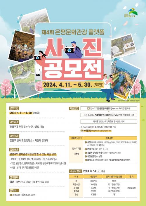 [Çѱ¹BBC¹æ¼Û ÀºÆò±¸=À̽ŵ¿±âÀÚ]ÀºÆò±¸´Â ¹®È­°ü±¤ Ȱ¼ºÈ­¸¦ À§ÇØ 'Á¦4ȸ ÀºÆò¹®È­°ü±¤ Ç÷§Æû »çÁø °ø¸ðÀü'À» ¿À´Â 11ÀϺÎÅÍ 5¿ù 30ÀϱîÁö 50ÀÏ µ¿¾È ÁøÇàÇÑ´Ù°í ¹àÇû´Ù. 2024 ÀºÆò±¸¹Î ÇØ¸ÂÀÌ Çà»ç, º¢²ÉÃàÁ¦ µî °ü³» ´Ù¾çÇÑ ¹®È­ Çà»ç¿Í ÀºÆòÀÇ ¸í¼Ò µîÀ» ¼Ò°³ÇÏ¡¦