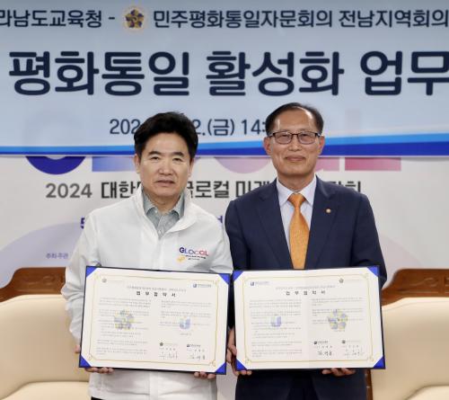 [Çѱ¹BBC¹æ¼Û Àü³²¿©¼ö=À̽ŵ¿±âÀÚ]Àü¶ó³²µµ±³À°Ã»°ú ¹ÎÁÖÆòÈ­ÅëÀÏÀÚ¹®È¸ÀÇ Àü³²Áö¿ªÈ¸ÀÇ(ºÎÀÇÀå ¿ì½ÂÇÏ)´Â 12ÀÏ Àü³²±³À°Ã» ºñÁî´Ï½º½Ç¿¡¼­ ¹Ì·¡¼¼´ëÀÇ ÆòÈ­ÅëÀÏ °¨¼ö¼º ÇÔ¾çÀ» À§ÇÑ ¾÷¹« Çù¾àÀ» ü°áÇß´Ù. À̹ø Çù¾à¿¡ µû¶ó µÎ ±â°üÀº Àü³² û¼Ò³âµéÀÌ ¹Ù¶÷Á÷ÇÑ Å롦