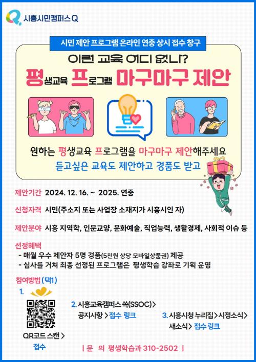 [Çѱ¹BBC¹æ¼Û ½ÃÈï½Ã=À̽ŵ¿±âÀÚ] ½ÃÈï½Ã´Â ½Ã¹ÎÀÇ ´Ù¾çÇÑ ¿ä±¸¸¦ ¹Ý¿µÇÑ ¸ÂÃãÇü Æò»ýÇнÀ ÇÁ·Î±×·¥À» ±âȹÇϰíÀÚ ¡®Æò»ýÇнÀ ÇÁ·Î±×·¥ ¸¶±¸¸¶±¸ Á¦¾È¡¯ ¿Â¶óÀÎ »ó½Ã Á¢¼ö ⱸ¸¦ ¿î¿µÇϸç, À̸¦ ÅëÇØ ¼±Á¤µÈ ½Ã¹Î Á¦¾È ÇÁ·Î±×·¥À» 2025³â ¿¬Áß ¿î¿µÇÒ °èȹÀÌ´Ù. ¡®Æò¡¦
