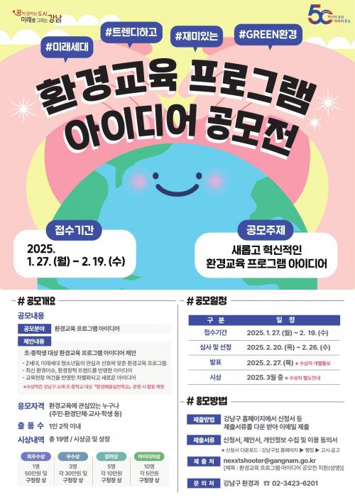 [Çѱ¹BBC¹æ¼Û °­³²±¸=À̽ŵ¿±âÀÚ] ²ÞÀÌ ¸ðÀÌ´Â µµ½Ã, ¹Ì·¡¸¦ ±×¸®´Â °­³²±¸°¡ âÀÇÀûÀÌ°í ½ÇÈ¿¼º ³ôÀº ȯ°æ±³À° ÄÜÅÙÃ÷¸¦ ¹ß±¼Çϱâ À§ÇØ ¡®2025³â ȯ°æ±³À° ÇÁ·Î±×·¥ °ø¸ðÀü¡¯À» 1¿ù 27ÀϺÎÅÍ 2¿ù 19ÀϱîÁö ÁøÇàÇÑ´Ù. ¿ÃÇØ·Î 3ȸ°¸¦ ¸Â´Â À̹ø °ø¸ðÀüÀº ¡®»õ·Ó°í Çõ¡¦