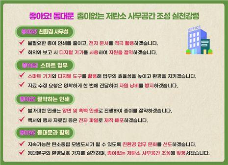 [Çѱ¹BBC¹æ¼Û µ¿´ë¹®±¸=À̽ŵ¿±âÀÚ] µ¿´ë¹®±¸°¡ ¡®Á¾ÀÌ ¾ø´Â Àúź¼Ò »ç¹«½Ç¡¯ Á¶¼ºÀ» º»°Ý ÃßÁøÇÑ´Ù. À̹ø Á¤Ã¥Àº Á¾ÀÌ Áß½ÉÀÇ ÇàÁ¤¿¡¼­ ¹þ¾î³ª ½º¸¶Æ® ±Ù¹«È¯°æÀ» Àû±Ø µµÀÔÇØ ¾÷¹« È¿À²À» ³ôÀ̰í, ÀÚ¿ø Àý¾à°ú ź¼ÒÁ߸³ ½Çõ ¹®È­¸¦ È®»êÇϱâ À§ÇØ ¸¶·ÃµÆ´Ù. ±¸´Â ¡¦