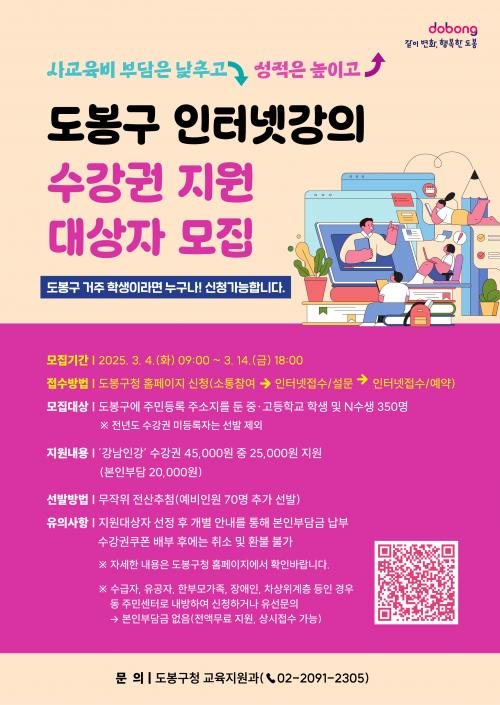 [Çѱ¹BBC¹æ¼Û µµºÀ±¸=À̽ŵ¿±âÀÚ] µµºÀ±¸°¡ ÀÎÅÍ³Ý ¼ö´É¹æ¼Û ¡®°­³²Àΰ­¡¯ ¼ö°­±Ç Áö¿ø ´ë»óÀÚ¸¦ ¸ðÁýÇÑ´Ù. ¾Õ¼­ ±¸´Â Áö³­ 2023³â Áö¿ª ³» Áß‧°íµîÇб³ ÇлýÀÇ »ç±³À°ºñ ºÎ´ãÀ» ¿ÏÈ­Çϱâ À§ÇØ °­³²±¸¿Í ¡®°­³²Àΰ­¡¯¿¡ ´ëÇÑ °øµ¿ÀÌ¿ëÇù¾àÀ» ü°áÇß´Ù. Áö¡¦