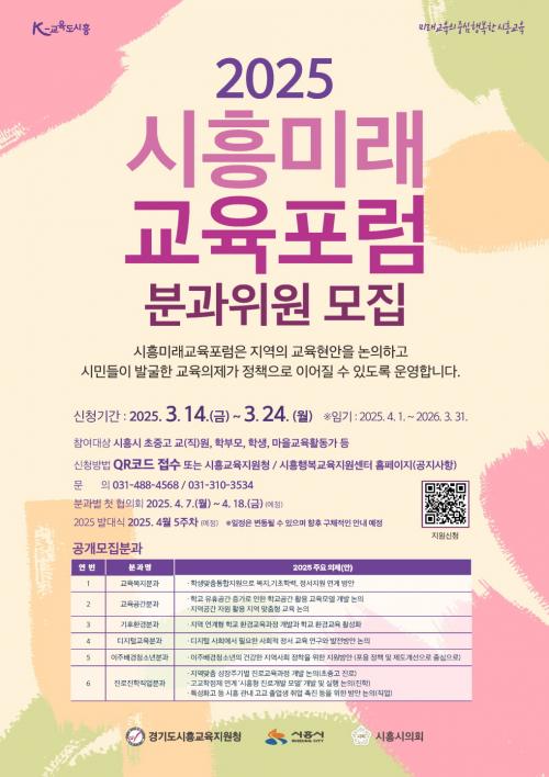 [Çѱ¹BBC¹æ¼Û ½ÃÈï½Ã=À̽ŵ¿±âÀÚ] ½ÃÈï½Ã´Â 3¿ù 14ÀϺÎÅÍ 24ÀϱîÁö ¡®2025 ½ÃÈï¹Ì·¡±³À°Æ÷·³¡¯ÀÇ ºÐ°úÀ§¿øÀ» °ø°³ ¸ðÁýÇÑ´Ù. ½ÃÈï¹Ì·¡±³À°Æ÷·³Àº ½ÃÈï½Ã¿Í °æ±âµµ½ÃÈï±³À°Áö¿øÃ», ½ÃÈï½ÃÀÇȸ°¡ ½ÃÈïÁö¿ª ±³À°°øµ¿Ã¼ °£ ¼ÒÅë°ú Çù¾÷À» ÅëÇØ ±³À°ÀÇÁ¦¸¦ ¹ß±¼Çϰí À̸¦ Á¤Ã¥¡¦