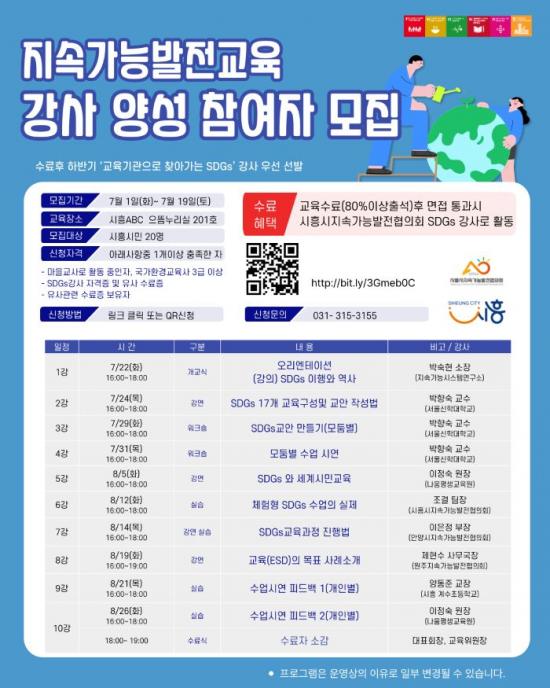[Çѱ¹BBC¹æ¼Û ½ÃÈï½Ã=À̽ŵ¿±âÀÚ] ½ÃÈï½ÃÁö¼Ó°¡´É¹ßÀüÇùÀÇȸ´Â ¿À´Â 7¿ù 22ÀϺÎÅÍ 8¿ù 26ÀϱîÁö ÁøÇàµÇ´Â ¡¸Áö¼Ó°¡´É¹ßÀü±³À° °­»ç ¾ç¼º°úÁ¤¡¹¿¡ Âü¿©ÇÒ ½Ã¹ÎÀ» 7¿ù 19ÀϱîÁö ¸ðÁýÇÑ´Ù. À̹ø ±³À°Àº Áö¼Ó°¡´É°³¹ß¸ñÇ¥(Sustainable Development Goals, ÀÌÇÏ SDGs)¿¡ ´ë¡¦