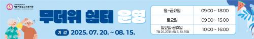 [Çѱ¹BBC¹æ¼Û ½ÃÈï½Ã=À̽ŵ¿±âÀÚ] ½ÃÈï½ÃºÏºÎ³ëÀκ¹Áö°ü(ÀÌÇÏ, ³ëÀκ¹Áö°ü)Àº ¿©¸§Ã¶ Æø¿°À¸·Î ÀÎÇÑ ¿Â¿­ÁúȯÀ» ¿¹¹æÇÏ°í ¾î¸£½ÅµéÀÇ °Ç°­°ú ¾ÈÀüÀ» Áö۱â À§ÇØ 7¿ù 20ÀϺÎÅÍ 8¿ù 15ÀϱîÁö ¹«´õÀ§½°Å͸¦ ¿î¿µÇÑ´Ù. ¹«´õÀ§½°ÅÍ´Â º¹Áö°üÀÌ ¿î¿µµÇ´Â ¿ù¿äÀÏ¿¡¼­ ±Ý¿ä¡¦