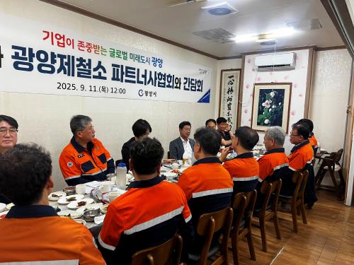 [Çѱ¹BBC¹æ¼Û Àü³²±¤¾ç=¹Ú±¤¿Á±âÀÚ] ±¤¾ç½Ã(½ÃÀå Á¤ÀÎÈ­)´Â 9¿ù 11ÀÏ ±¤¾çÁ¦Ã¶¼Ò ÆÄÆ®³Ê»çÇùȸ¿Í °£´ãȸ¸¦ ¿­°í, ±â¾÷ ÇöÀåÀÇ ¾Ö·Î»çÇ×À» ûÃëÇÏ¸ç »óÈ£ Çù·Â ¹æ¾ÈÀ» ³íÀÇÇß´Ù. °£´ãȸ¿¡´Â ±¤¾çÁ¦Ã¶¼Ò ÆÄÆ®³Ê»çÇùȸ ÇùȸÀåÀÎ ¢ßÆ÷½ºÇ÷¹ÀÌÆ® Á¤Çö¼ö ´ëÇ¥¸¦ ºñ·ÔÇØ (ÁÖ¡¦
