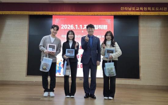 [Çѱ¹BBC¹æ¼Û Àü³²¸ñÆ÷=À̽ŵ¿±âÀÚ] Àü¶ó³²µµ±³À°Ã»¸ñÆ÷µµ¼­°üÀº 2026³â 1¿ù 1ÀÏ ÀÚ·Î ÀÓ¿ëµÈ ½Å±Ô°ø¹«¿ø 3¸íÀÇ Ã¹ °øÁ÷ »ýȰÀ» ÀÀ¿øÇϱâ À§ÇÑ È¯¿µ Çà»ç¸¦ ÁøÇàÇß´Ù. À̹ø ȯ¿µ½ÄÀº »õÇØ¸¦ ¸Â¾Æ µµ¼­°ü °¡Á·ÀÌ µÈ ½Å±Ô°ø¹«¿ø(ÇàÁ¤Á÷ 2¸í, »ç¼­Á÷ 1¸í)À» ȯ¿µÇÏ°í °ø¡¦