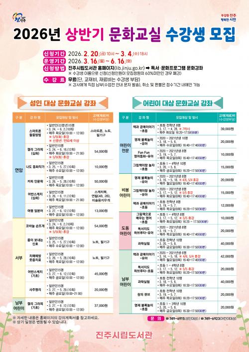 [Çѱ¹BBC¹æ¼Û °æ³²ÁøÁÖ=³²±Ã¿µ±â±âÀÚ] ÁøÁֽø³µµ¼­°üÀº ¿À´Â 20ÀϺÎÅÍ ¾î¸°ÀÌ¿Í ¼ºÀÎÀ» ´ë»óÀ¸·Î ¡®2026³â »ó¹Ý±â ¹®È­±³½Ç¡¯ ¼ö°­»ýÀ» ¸ðÁýÇÑ´Ù. ¡®¾î¸°ÀÌ ¹®È­±³½Ç¡¯Àº 3¿ù 16ÀϺÎÅÍ 5¿ù 18ÀϱîÁö ¾î¸°ÀÌÀü¹®¡¤µµµ¿¾î¸°ÀÌ¡¤ºñºÀ¾î¸°ÀÌ¡¤³²ºÎ¾î¸°À̵µ¼­°ü¿¡¼­ °úÇС¦