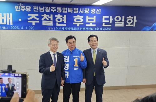 [Çѱ¹BBC¹æ¼Û ¿©¼ö=±è±â³² ±âÀÚ] Àü³²¡¤±¤ÁÖ ÅëÇÕÆ¯º°½ÃÀå ¼±°Å¸¦ ¾ÕµÎ°í ´õºÒ¾î¹ÎÁÖ´ç °æ¼±¿¡ ³ª¼± ÁÖöÇö Èĺ¸¿Í ¹ÎÇü¹è Èĺ¸ÀÇ ´ÜÀÏÈ­¿¡ ´ëÇØ ±è¿µ±Ô ¿©¼ö½ÃÀå ¿¹ºñÈ帰¡ 1ÀÏ È¯¿µ ÀÔÀåÀ» ¹àÇû´Ù. ±è ¿¹ºñÈ帴 À̳¯ ÀÔÀå¹®À» Åë·¡ ¡°À̹ø ´ÜÀÏÈ­´Â ´Ü¼øÇÑ Èĺ¸¡¦