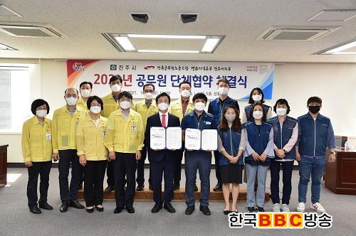 [Çѱ¹BBC¹æ¼Û=¼È¿°æ ±âÀÚ] ÁøÁÖ½Ã¿Í Àü±¹°ø¹«¿ø³ëµ¿Á¶ÇÕ ÁøÁÖ½ÃÁöºÎ´Â ÁøÁÖ½Ãû »óȲ½Ç¿¡¼ Á¶±ÔÀÏ ½ÃÀå°ú ±è¿µÅ ÁöºÎÀåÀ» ºñ·ÔÇÑ ³ë»ç ¾çÃø ±³¼·À§¿øÀÌ Âü¼®ÇÑ °¡¿îµ¥ 2021³â ´ÜüÇù¾à ü°á½ÄÀ» °¡Á³½À´Ï´Ù.