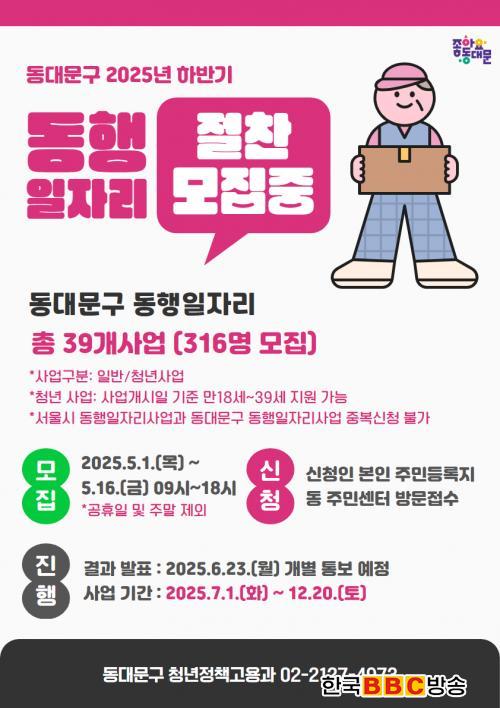 [Çѱ¹BBC¹æ¼Û µ¿´ë¹®±¸=À̽ŵ¿±âÀÚ] ¼­¿ï µ¿´ë¹®±¸´Â 5¿ù 1ÀϺÎÅÍ 16ÀϱîÁö ¡®2025³â ÇϹݱ⠵¿´ë¹®±¸ µ¿ÇàÀÏÀÚ¸®»ç¾÷¡¯ Âü¿©ÀÚ 316¸íÀ» ¸ðÁýÇÑ´Ù.