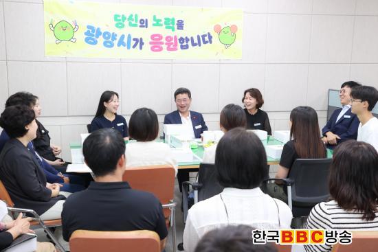 ¡®±¤¾ç½Ã°¡ ÀÀ¿øÇÕ´Ï´Ù¡¯´Â ±¤¾ç½ÃÀåÀÌ ¸Å¿ù ÇÑ ºÎ¼¸¦ ã¾Æ Á÷¿øµéÀÇ ¾Ö·Î»çÇ×À» ûÃëÇϰí, ÀÚÀ¯·Ó°Ô ÀǰßÀ» ³ª´©´Â Á÷¿ø ¼ÒÅë Çà»ç´Ù. À̹ø¿¡ ¹æ¹®ÇÑ °ø¿ø°ú´Â Ư»ö ÀÖ´Â ¸íǰ °ø¿ø Á¶¼º, ģȯ°æ ³ì»ö°ø°£ È®´ë, ½Ã¹Î Ä£ÈÀû °ø¿ø¹®È È®»ê, ¿©¸§Ã¶ ¹°³îÀÌÅÍ ¿î¿µ µîÀ» ÅëÇØ ½Ã¹Î °Ç° ÁõÁø°ú »îÀÇ Áú Çâ»ó¿¡ ±â¿©Çϰí ÀÖ´Â ºÎ¼´Ù. Á¤ ½ÃÀåÀº ¡®Áö¼Ó °¡´ÉÇÑ ³ì»ö µµ½Ã ±¤¾ç¡¯À» À§ÇØ Èû¾²´Â Á÷¿øµéÀ» °Ý·ÁÇÏ¸ç °£½ÄÀ» Àü´ÞÇß´Ù.