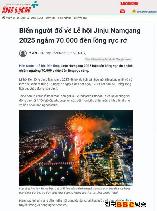 Áö³­ 10¿ù 5ÀÏ, º£Æ®³² ÁÖ¿ä ¹æ¼Û»çÀΠȣÂî¹Î½ÃƼÅÚ·¹ºñÀü(Ho Chi Minh City Television, HTV)¿¡¼­µµ ÃàÁ¦ ¼Ò½ÄÀ» º¸µµÇßÀ¸¸ç, º£Æ®³² ±¹¿µ¹æ¼Û º¸À̽º ¿Àºê º£Æ®³²(VOV)°ú À¯·Â Àϰ£Áö ¶ó¿Àµ¿(Lao Động)Àº °¢°¢ ¡¸7¸¸ °³ ÀÌ»óÀÇ µîºÒÀÌ ¹àÈ÷´Â 2025 ÁøÁÖ³²°­À¯µîÃàÁ¦¡¹, ¡¸7¸¸ °³ÀÇ Âù¶õÇÑ µîÀ» º¸±â À§ÇØ ¼ö¸¹Àº ÀÎÆÄ°¡ 2025 ÁøÁÖ³²°­À¯µîÃàÁ¦·Î ¸ð¿© µé´Ù!¡¹¶ó´Â Á¦¸ñÀ¸·Î °ü·Ã ±â»ç¸¦ °ÔÀçÇß´Ù.