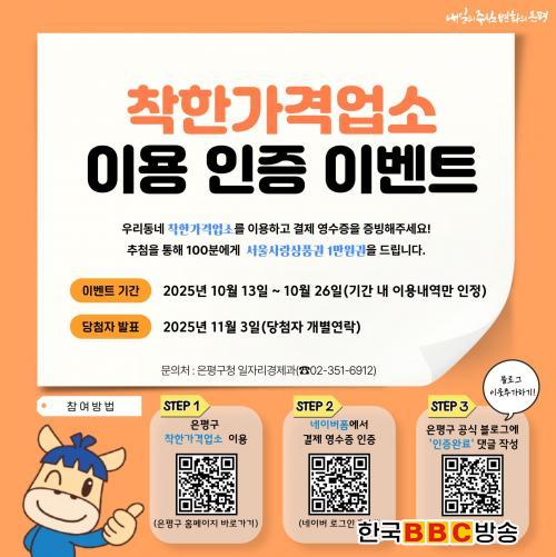 [Çѱ¹BBC¹æ¼Û ÀºÆò±¸=À̽ŵ¿±âÀÚ] ¼¿ï ÀºÆò±¸´Â Áö¿ª °æÁ¦ Ȱ¼ºÈ¿Í ¹°°¡ ¾ÈÁ¤ ºÐÀ§±â Á¶¼ºÀ» À§ÇØ 13ÀϺÎÅÍ ¿À´Â 26ÀϱîÁö 2ÁÖ°£ ¡®ÂøÇѰ¡°Ý¾÷¼Ò ÀÌ¿ë ÀÎÁõ À̺¥Æ®¡¯¸¦ ÁøÇàÇÑ´Ù°í ¹àÇû´Ù.