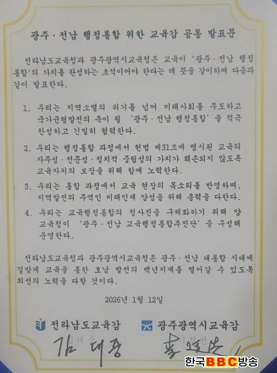 Àü³²±³À°Ã»°ú ±¤ÁÖ±³À°Ã»Àº ¹ßÇ¥¹®¿¡¼ ¡°Áö¿ª ¼Ò¸êÀÇ À§±â¸¦ ³Ñ¾î ¹Ì·¡ »çȸ¸¦ ÁÖµµÇÏ°í ±¹°¡ ±ÕÇü ¹ßÀüÀÇ ÃàÀÌ µÉ ¡®±¤ÁÖ¡¤Àü³² ÇàÁ¤ÅëÇÕ¡¯À» Àû±Ø Âù¼ºÇÏ°í ±ä¹ÐÈ÷ Çù·ÂÇÑ´Ù.¡±°í ¹àÇû´Ù.