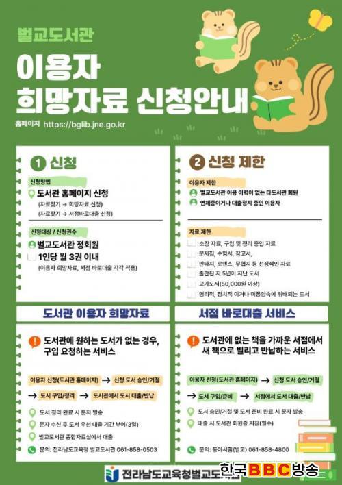 [Çѱ¹BBC¹æ¼Û Àü³²¹ú±³=À̽ŵ¿±âÀÚ] Àü¶ó³²µµ±³À°Ã»¹ú±³µµ¼­°üÀº µµ¼­°ü ÀÌ¿ëÀÚÀÇ µ¶¼­ ¸¸Á·µµ¸¦ ³ôÀ̰í ÀÚ·á ÀÌ¿ë ÆíÀǸ¦ °­È­Çϱâ À§ÇØ ¡®ÀÌ¿ëÀÚ Èñ¸ÁÀÚ·á ¼­ºñ½º¡¯¿Í ¡®¼­Á¡ ¹Ù·Î´ëÃâ¼­ºñ½º¡¯¸¦ ¿î¿µÇϰí ÀÖ´Ù.