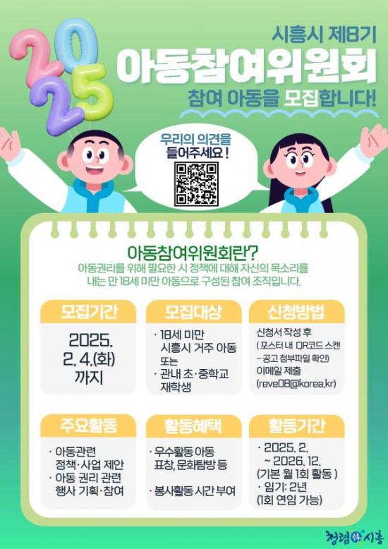 [Çѱ¹BBC¹æ¼Û ½ÃÈï½Ã=À̽ŵ¿±âÀÚ] ½ÃÈï½Ã´Â ¡®Á¦8±â ½ÃÈï½Ã ¾Æµ¿Âü¿©À§¿øÈ¸¡¯¸¦ »õ·Ó°Ô ±¸¼ºÇϰíÀÚ Âü¿© ¾Æµ¿À» 2¿ù 4ÀϱîÁö ¸ðÁýÇÑ´Ù. ¾Æµ¿Âü¿©À§¿øÈ¸´Â ¾Æµ¿ÀÇ ±Ç¸® ÁõÁø°ú Á¤Ã¥ Âü¿©¸¦ ¸ñÇ¥·Î ÇÑ ½ÃÈï½ÃÀÇ ´ëÇ¥ÀûÀÎ ¾Æµ¿ Âü¿© ±â±¸·Î, ±Â³×À̹ö½º °æ±â¼­ºÎÁöºÎ¿Í ¡¦