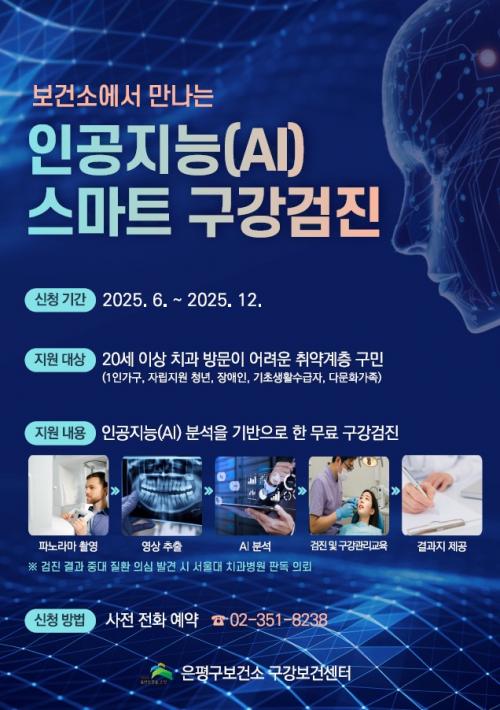 [Çѱ¹BBC¹æ¼Û ÀºÆò±¸=À̽ŵ¿±âÀÚ] ¼­¿ï ÀºÆò±¸´Â º¸°Ç¼Ò¿¡¼­ ÀΰøÁö´É(AI) ºÐ¼®À» ±â¹ÝÀ¸·Î ÇÑ ¡®½º¸¶Æ® ±¸°­°ËÁø °ü¸® ½Ã½ºÅÛ¡¯À» ³»´ÞºÎÅÍ º»°Ý ¿î¿µÇϰí 22ÀϺÎÅÍ »çÀü ÀüÈ­ Á¢¼öÇÑ´Ù°í ¹àÇû´Ù. ±¸°­Áúȯ Áß Ä¡ÁÖÁúȯÀº ½Åü °Ç°­°úµµ ¹ÐÁ¢ÇÑ ¿¬°üÀÌ ÀÖÀ¸¸ç, ´ç´¢¡¦